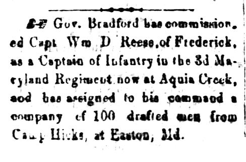 Capt. Wm D Reese, of Frederick, has been commissioned a Captain in the 3rd MD Infantry Regt. by Gov. Bradford and assigned a company of 100 drafted men from Camp Hicks at Easton.