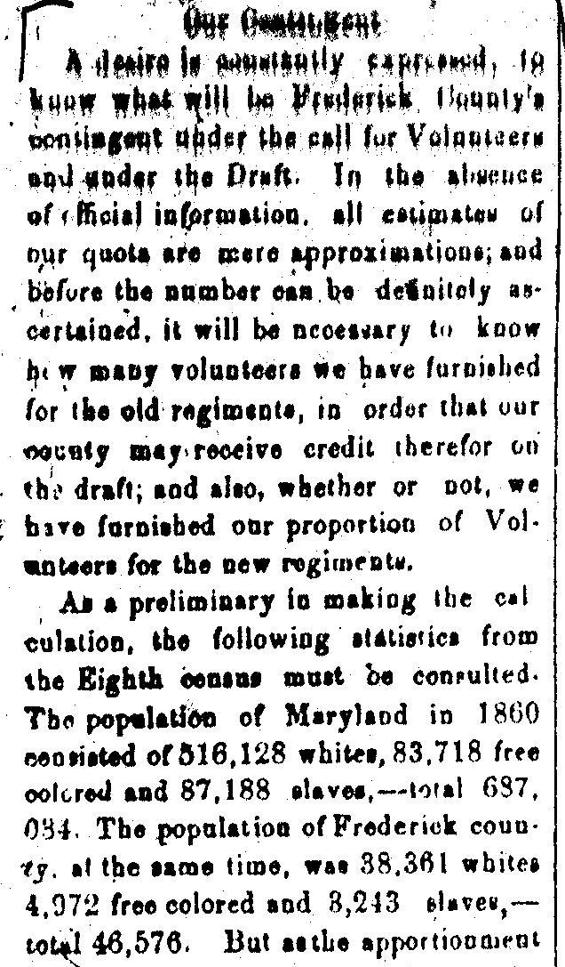 Speculation about how many volunteers will be needed to supply Frederick Co.'s quota for the new regiments called for and about the effect of the coming draft on the secessionists who have not been volunteering.