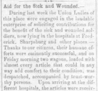 Account of efforts by Union ladies in Carroll County to collect supplies for the military hospitals in Frederick and Washington County.