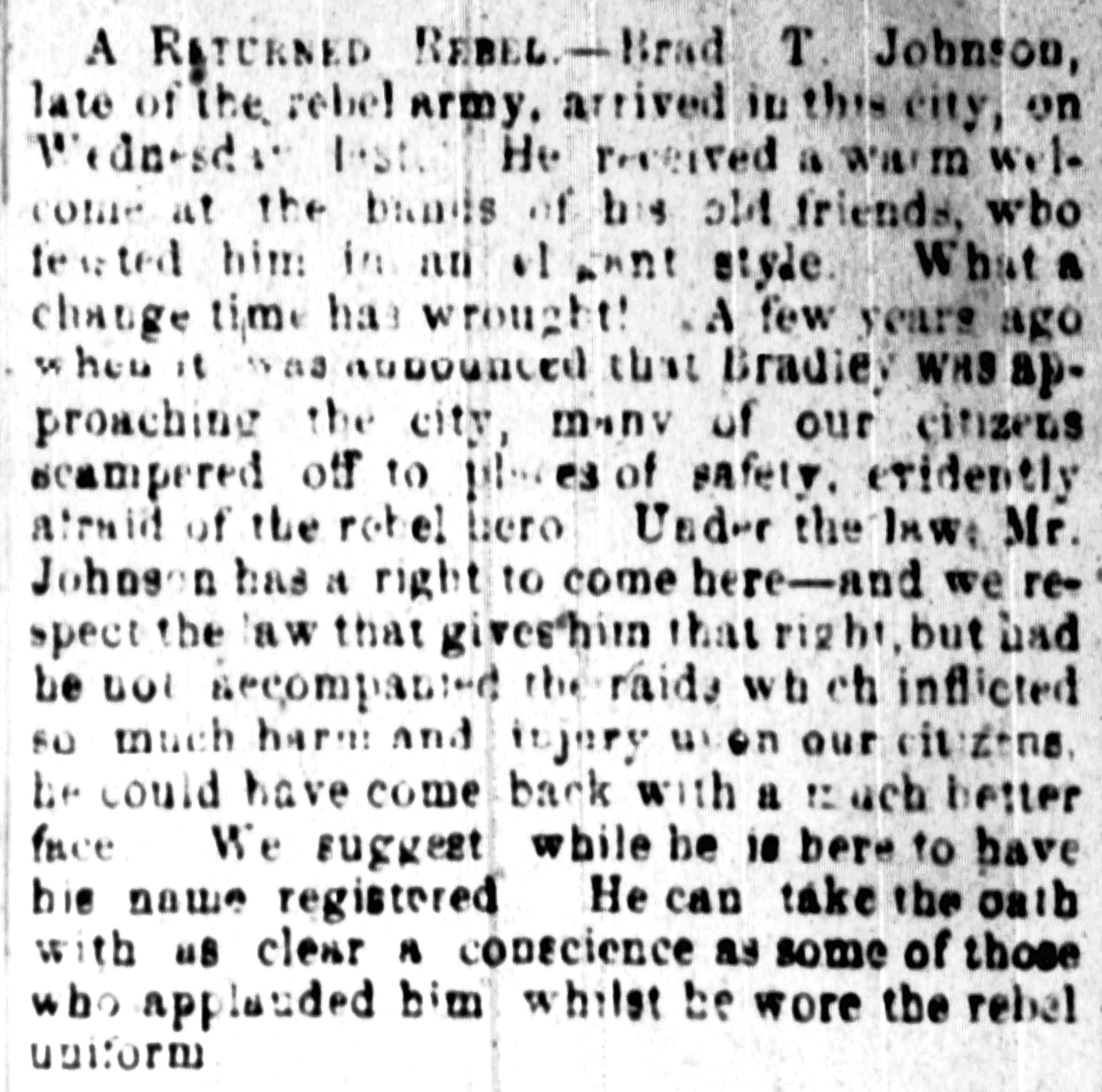 Former Frederick resident and Confederate General Bradley T. Johnson arrived in town last Wednesday where he was welcomed by his old friends. When Johnson visited the town with the Confederate army, however, the raids inflicted much “harm and injury” on the citizens. Had he not done so, he could have returned “with a much better face.”
