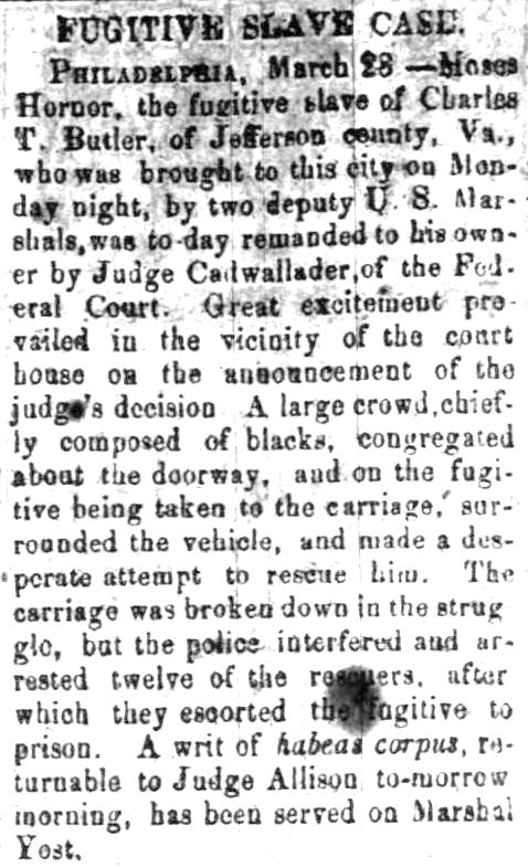 Report from Philadelphia of attempted rescue of fugitive slave, Moses Hornor, remanded by Judge Cadwallader to his master, Charles T. Butler of Jefferson Co., VA.