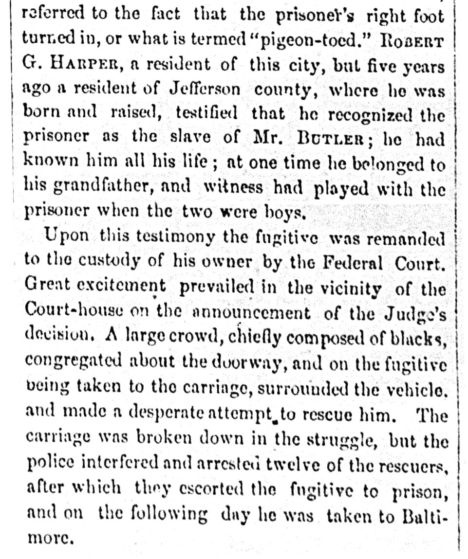 Charles T. Butler, a fugitive slave from Jefferson County, VA, was arrested near Harrisburg, PA, and taken to Philadelphia where a judge, upon hearing the testimony of witnesses, remanded him to the custody of his owner. A large crowd, mostly composed of blacks, attempted to rescue Butler, but failed.