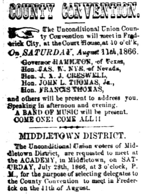 Notices of Unconditional Union convention in Frederick and meeting to elect delegates in Middletown District