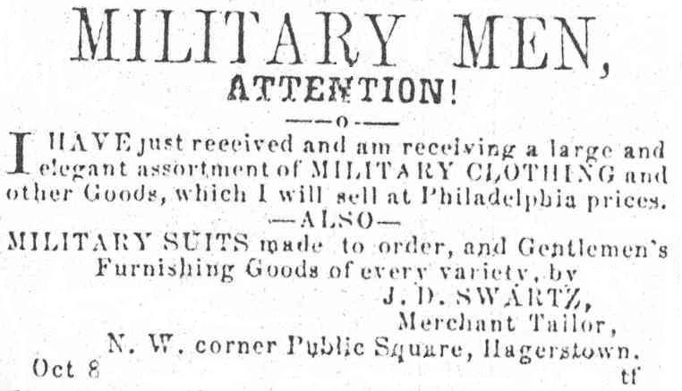 J.D. Swartz, Hagerstown tailor, advertises a large and elegant assortment of military clothing.