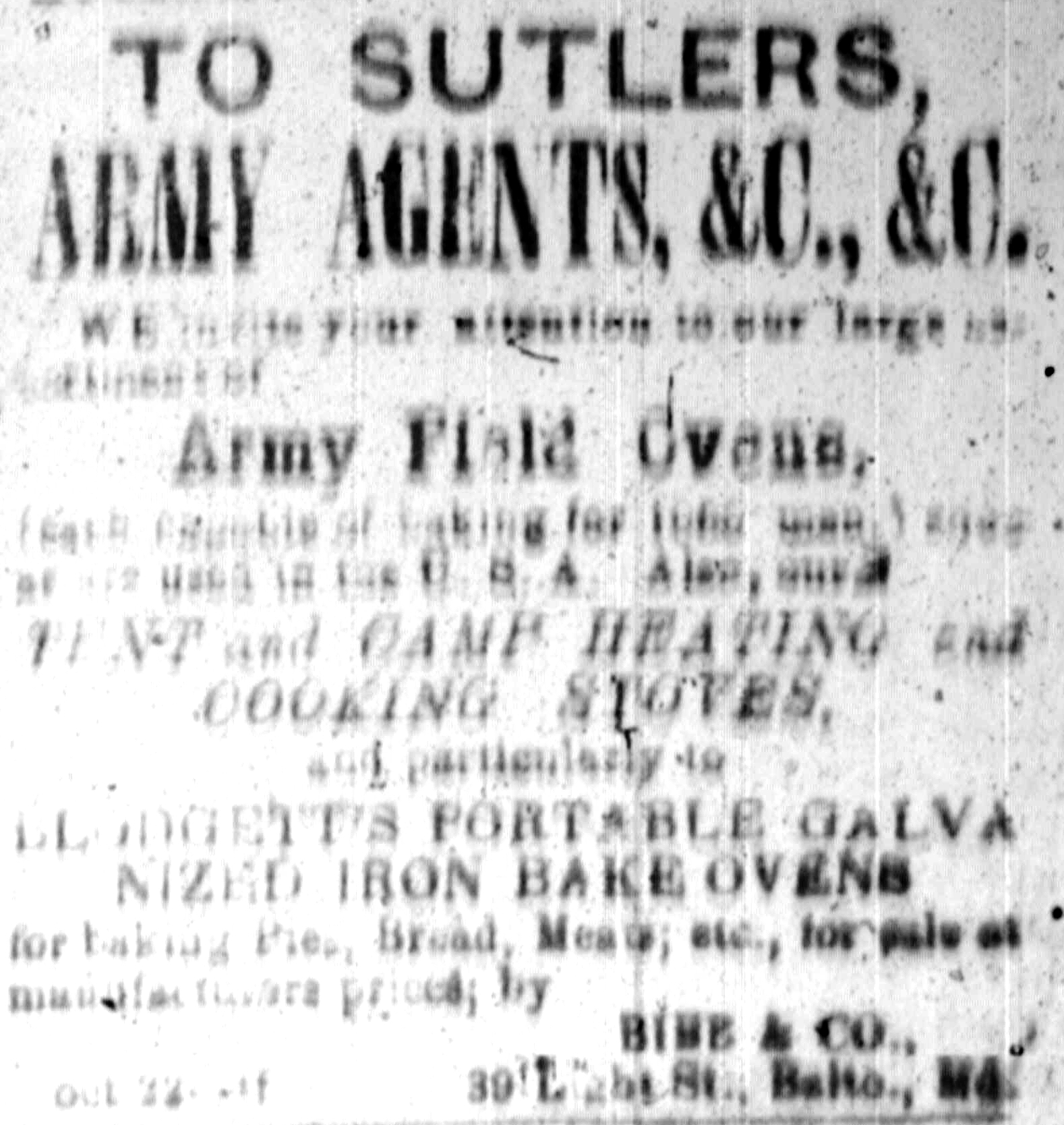 Advertisement of Bibb & Co., Baltimore, for Army field ovens, tent and camp heating stoves, and portable ovens.