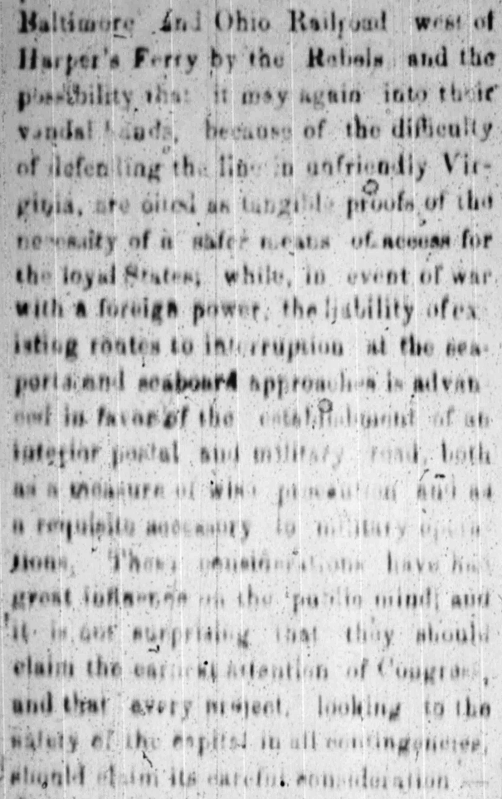 Article [partly illegible] discussing possible routes for railroad expansion through Frederick County to improve communication lines between Washington and the West. B & ), Metropolitan and Western MD RR mentioned.