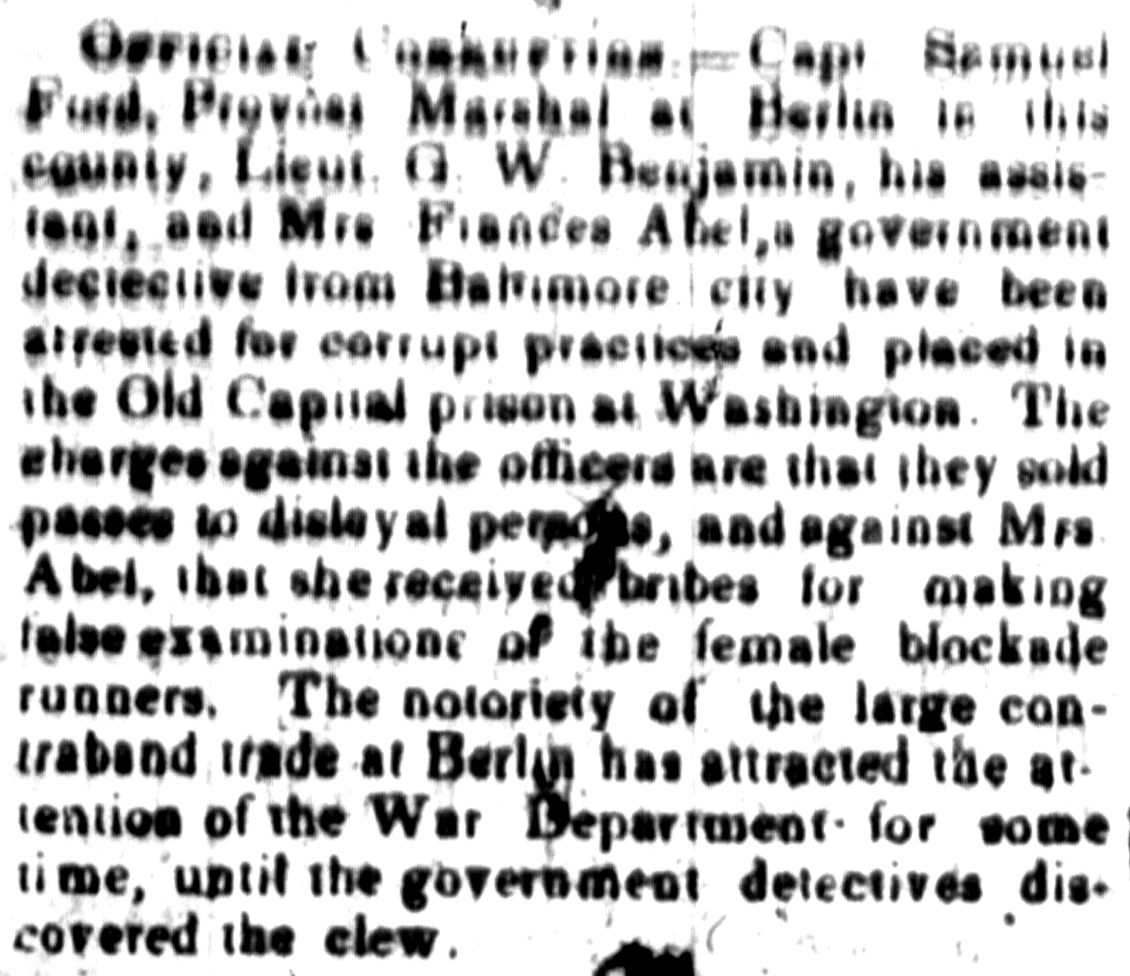 At Berlin, Provost Marshal Capt. Ford, his assistant Lt. Benjamin, and Mrs. Frances Abel have been arrested for selling passes to Rebels and making false examinations of female blockade runners. Now in Old Capitol prison in DC.