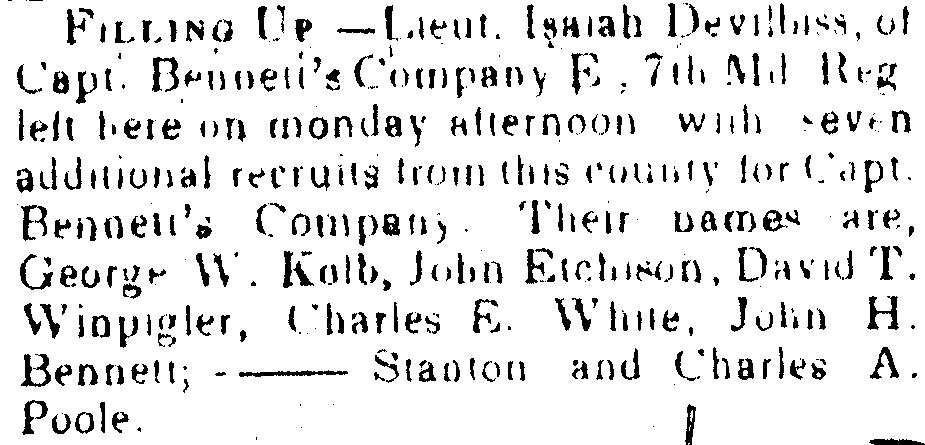 Lieut. Isaiah Devilbliss left Frederick city with 7 new recruits from Frederick County for Capt. Bennett's Co. E, 7th MD Regt. Lists names of new recruits.
