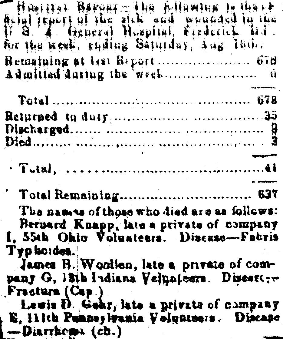 Official report of the total number of soldiers in the U.S.A. General Hospital in Frederick City ending the week of August 16th. There were 678 men in the hospital. 35 were returned to duty, 3 were discharged and 3 died. The dead were: Private Bernard Knapp, Co. I, 55th Ohio Volunteers; Private James R. Woollen (sp?), Co. G., 13th Indiana Volunteers, and Private Lewis D. Gehr, Co. E, 111th PA Volunteers.