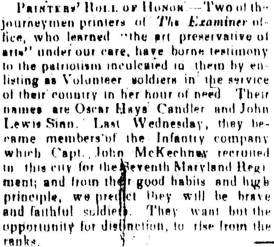 Two journeymen printers from the Frederick Examiner voluntarily enrolled in the 7th MD Regt. They are: Oscar Hays Candler and John Lewis Sinn. They are members of the infantry company commanded by Capt. John McKechney and the paper expresses belief that they will be brave and faithful soldiers and rise in the ranks if given the opportunity.