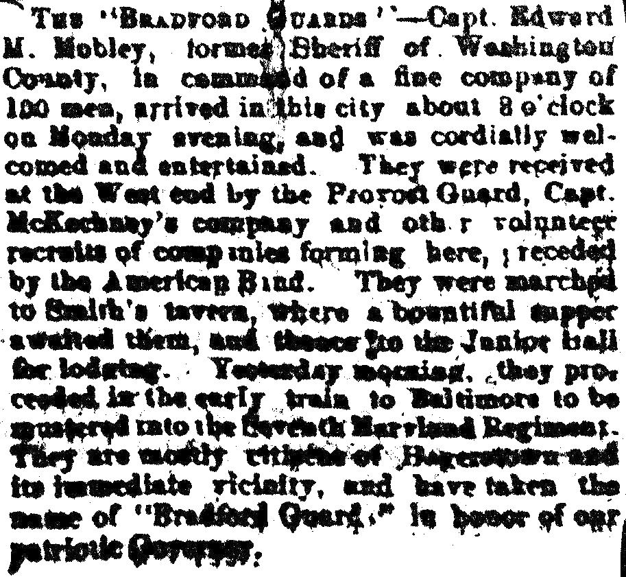 Capt. Edward M. Mobley, former Sheriff of Washington County, led a fine company of 100 men into Frederick. They have taken the name "Bradford Guards" in honor of Maryland's governor. They were given a bountiful supper at Smith's Tavern and spent the night at Junior Hall before taking the train to Baltimore to be mustered into the 7th Maryland Regiment. The men are worthy citizens of Hagerstown and vicinity.