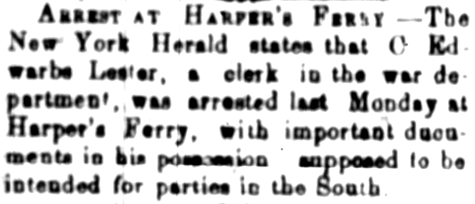 C. Edward Lester, a clerk in the War Department, was arrested in Harper's Ferry with important documents in his possession supposedly intended for the South. The news was printed in the New York Herald.