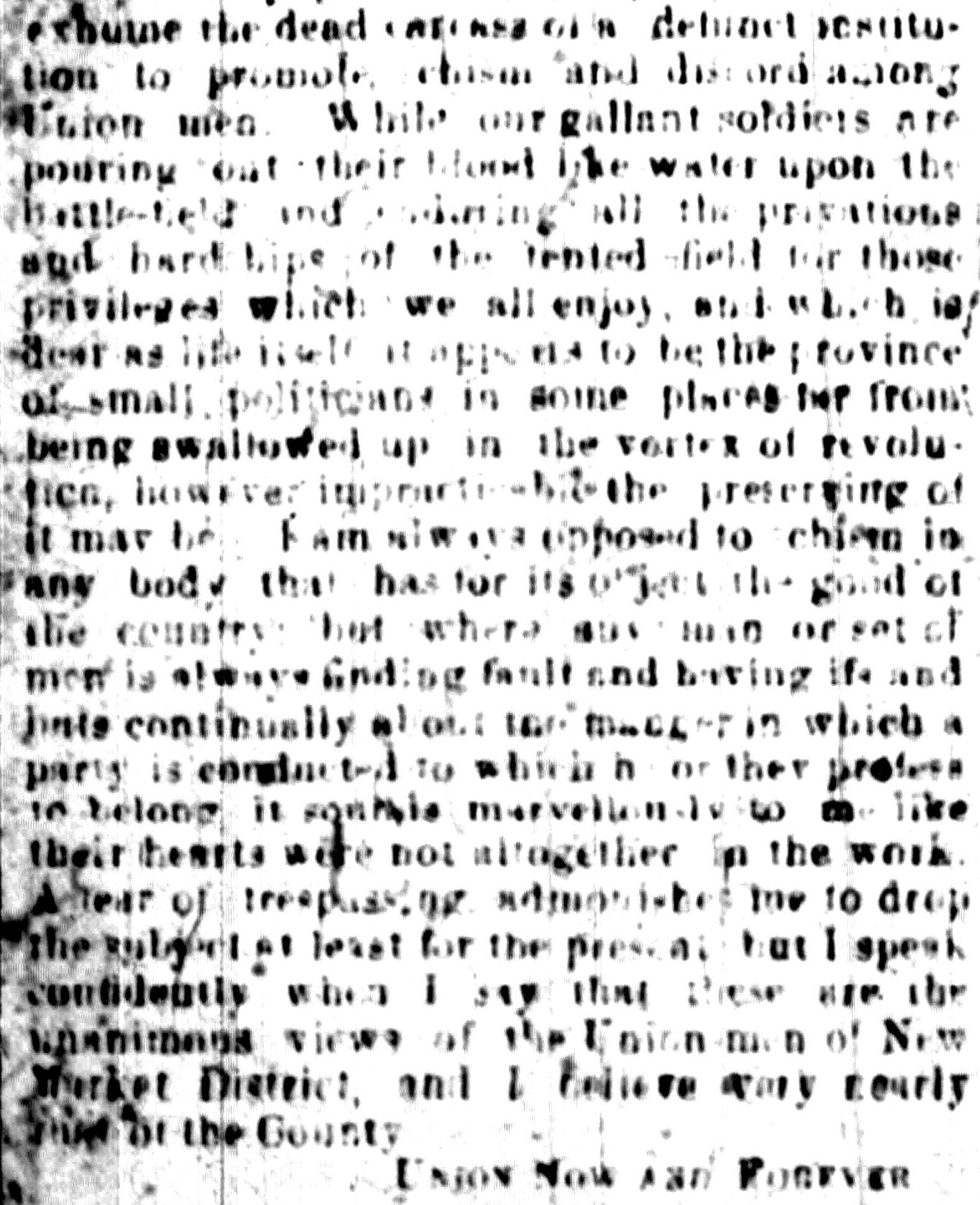 Letter to the editor signed "Union Now and Forever" from the New Market District discussing the political stance taken by the Maryland Union in regard to the recent County Convention.