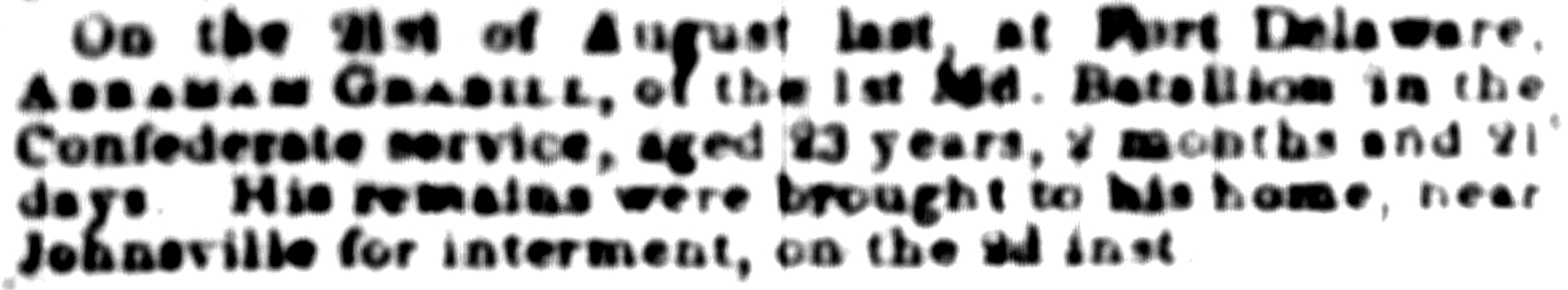 Abraham Grabill, of the 1st MD Battalion in Confederate service, died at Fort Delaware on the 21st of August and his remains have been sent to his home in Johnsville for interment. His age was 23 years, 2 months and 21 days.