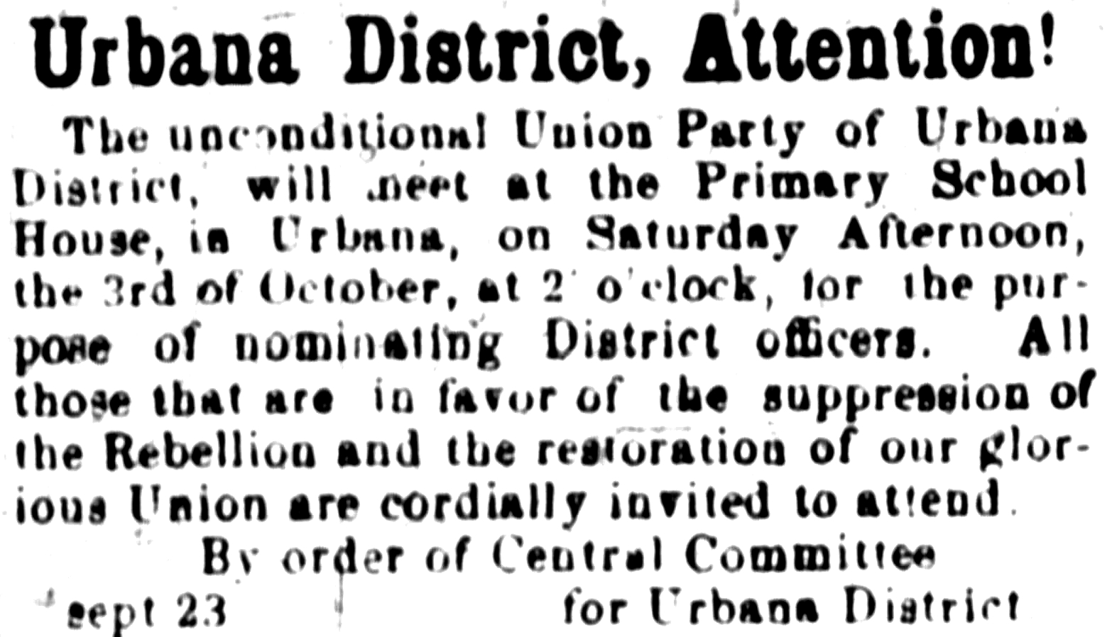Notice: The Unconditional Union Party of Urbana District will meet on October 3 to nominate District officers. All those in favor of suppressing the rebellion and restoring the union are invited to attend.