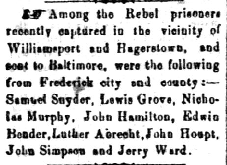 List of local men from Fred. city and county among the Rebel prisoners recently captured in Washington Co.: Snyder, Grove, Murphy, Hamilton, Bender, Abrecht, Houpt, Simpson, Ward.
