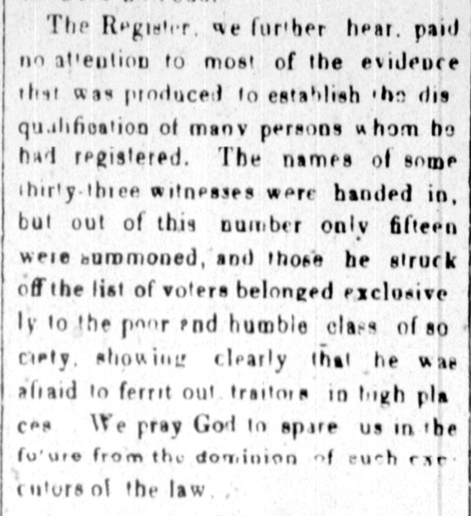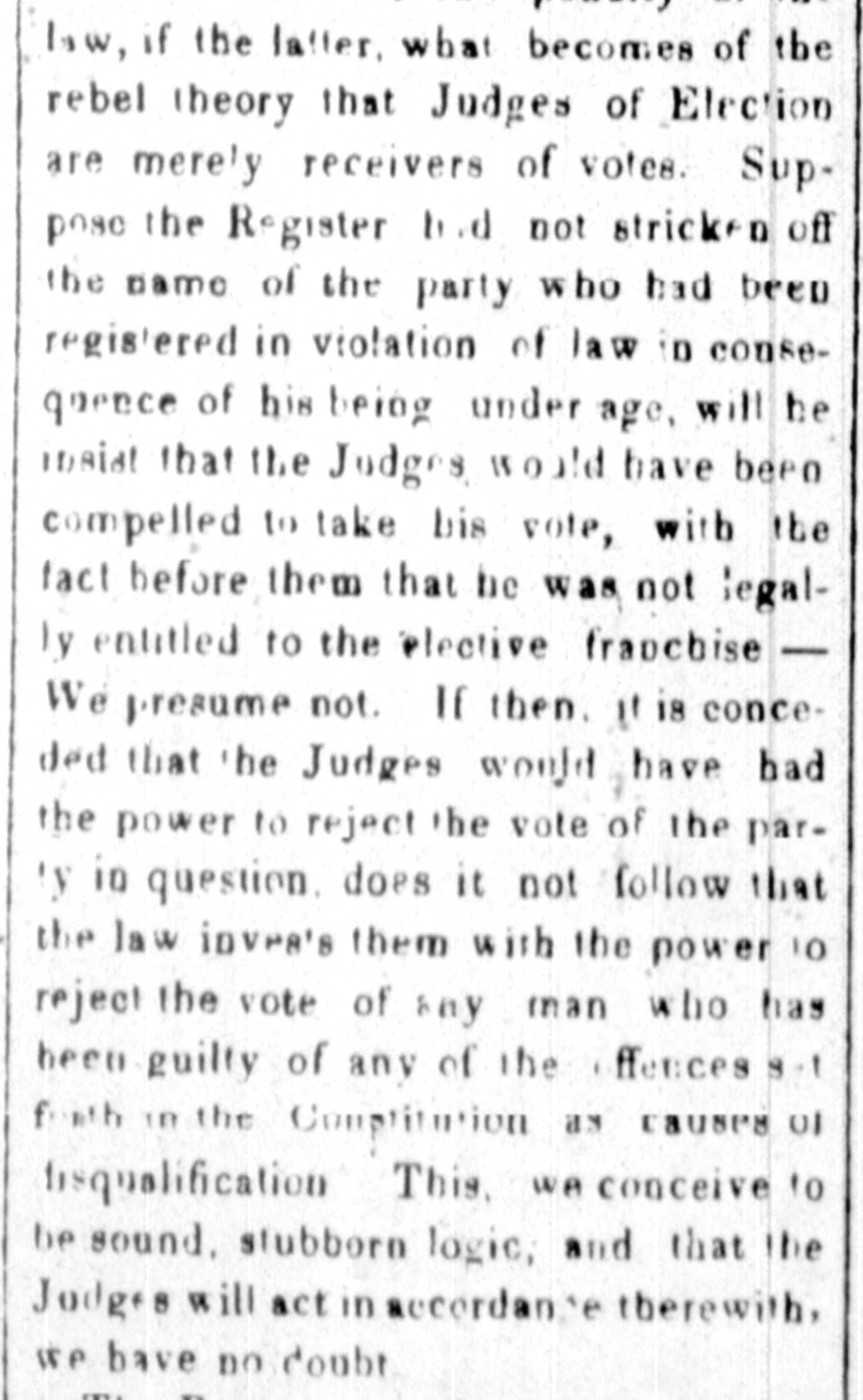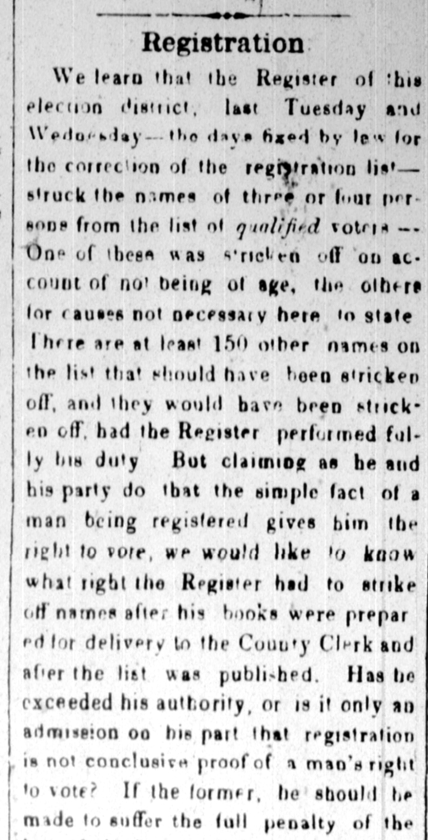 Register of Frederick Election District questioned about his act of striking names off voting lists after lists had been published and were ready to go to the County Clerk. Who has right to determine eligibility to vote - election judges or register? Clearly Register did not fully investigate cases of some voters who were registered but should have been disqualified.