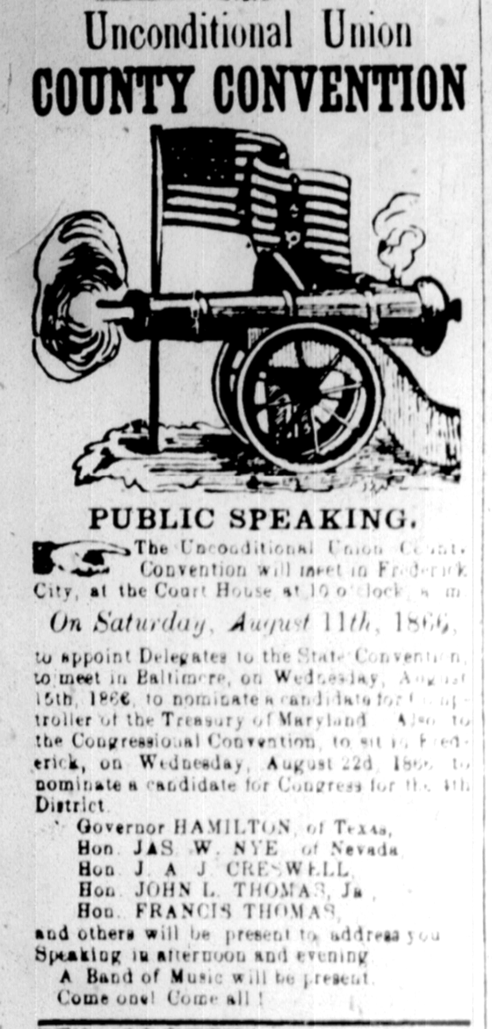 The Unconditional Union County Convention will meet to select delegates to send to the State Convention to select a nominee for Comptroller of the Treasury and delegates to the Congressional Convention to select a nominee for the district seat in Congress. Speakers at County Convention will include Gov. Hamilton of Texas and Hon. Francis Thomas.