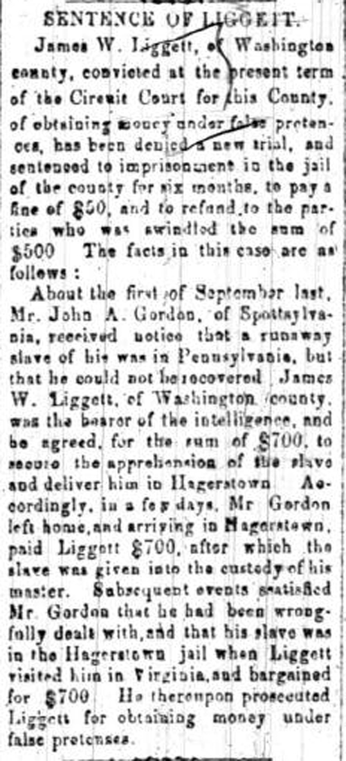 James W. Liggett of Washington County was convicted by the Circuit Court of Washington Co. for obtaining money under false pretenses. Liggett visited slaveowner John A. Gordon of Spotsylvania, VA, who had advertised for a runaway slave. Liggett said that he would return the runaway slave who was in PA for a fee of $700. The slave, in fact, was already captured and in the Hagerstown jail. After the slave was turned over to his master, Gordon realized that Liggett had not captured the slave so he prosecuted Liggett for obtaining his $700 under false pretenses.
