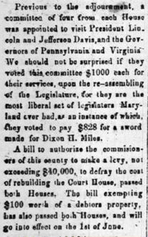 The legislature of Maryland (called "this corrupt body" by the paper) is currently meeting and resolving little for the public; instead, it seems to be creating resolutions and tending to secession. It will send delegations to the governors of Virginia and Pennsylvania. The paper supposes the delegations will be well-funded at the expense of taxpayers as this session of the MD legislature is very liberal with supplying money. A bill to authorize the Frederick Co. commissioners to levy $40,000 to rebuild the Court House was passed.