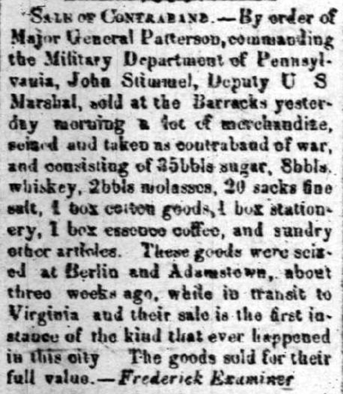 Contraband goods seized at Berlin and Adamstown have been sold at the Barracks in Frederick by John Stimmel, Deputy U S Marshal.