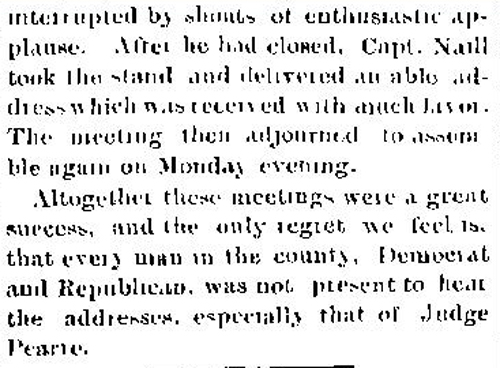 The Republican meeting in Hagerstown a great success, music by the Leitersburg Band, speeches by Judges Armour and Weisel John E. Smith of Carroll Co..Geo. French, Geo. Pearre and Capt. Naill.