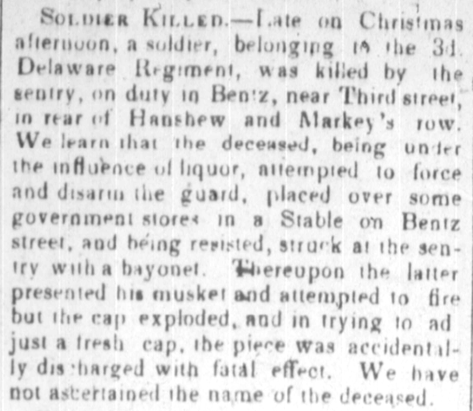 A drunken Delaware soldier's attempt to disarm a guard at a government storehouse in Frederick resulted in his death on Christmas day..