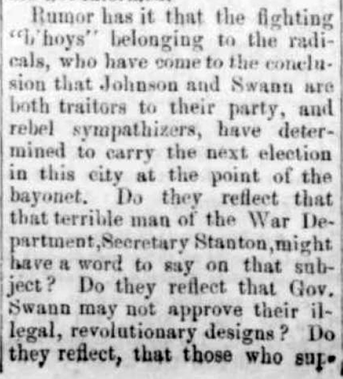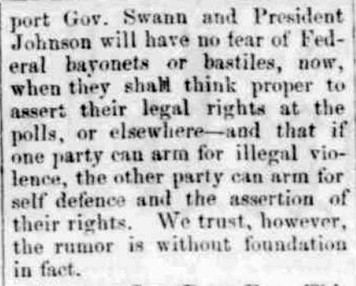 The sound of drum and fife in Frederick streets suggests that the Radicals may be planning forcible action to defend themselves, but, says the Citizen, "the other party can arm for self defence and the assertion of their rights."