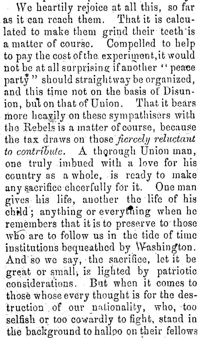 The new tax bill will show "Rebel sympathizers what is the "actual cost of the little experiment, recently inaugurated by their fellows, of an attempt to break up the best Government on earth"