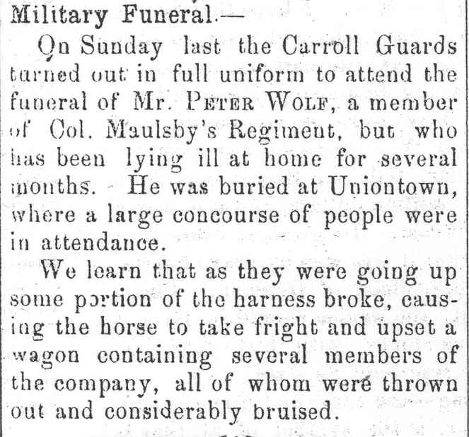The Carroll Guards turned out in uniform for the funeral of Peter Wolf, a member of Col. Maulsby's regiment, who had been ill for several months
