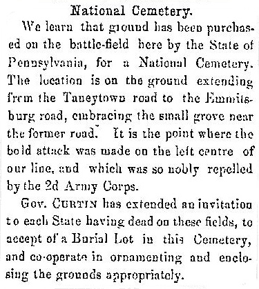 The state of Pennsylvania has bought land on the battle-ground of Gettysburg in order to make a National Cemetery to commemorate those who died in the Battle of Gettysburg