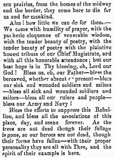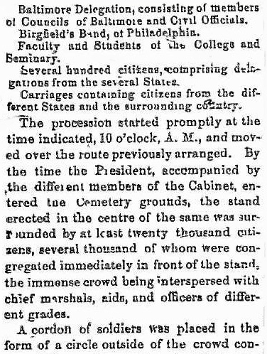 Article gives a full account of the Consecration ceremony including: a prayer by Rev. T.H. Stockton, an oration by a Mr. Everett, the closing ceremonies, Lincoln's Gettysburg Address, and a speech by William H. Seward.