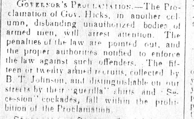 Gov. Hicks has made illegal any unauthorized armed groups in the state. Bradley T. Johnson is specifically mentioned.