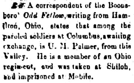 Soldier from Middletown named U.M. Palmer awaits exchange in Ohio, having been paroled after capture at Shiloh. He is a member of an Ohio regiment. [from Boonsboro Odd Fellow]