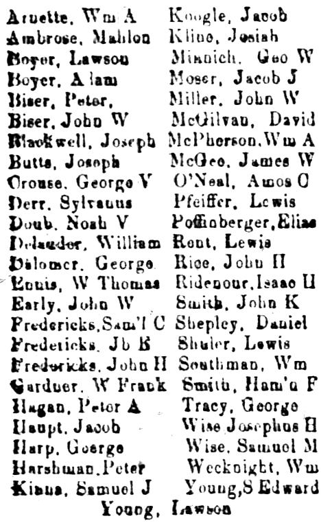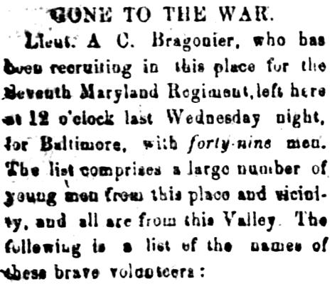Lt. A. C. Bragonier departed Middletown with 49 volunteers for the 7th MD Reg.; all of the men are from the Middletown Valley and their names are listed.