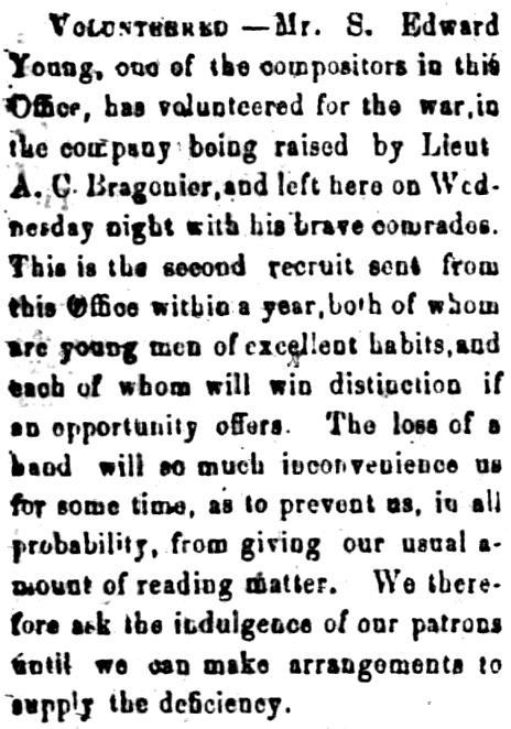 S. Edward Young, one of the compositors in the Middletown Valley Register's office, volunteered for the company recently raised by Lt. A. C. Bragonier for the 7th MD Reg.