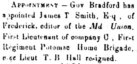 James T. Smith, Esq., of Frederick, editor of the Maryland Union, has been appointed 1st Lt. of Company C, 1st Potomac Home Brigade.