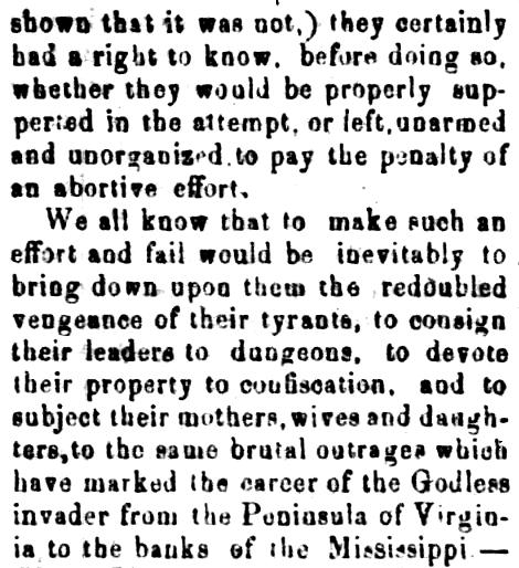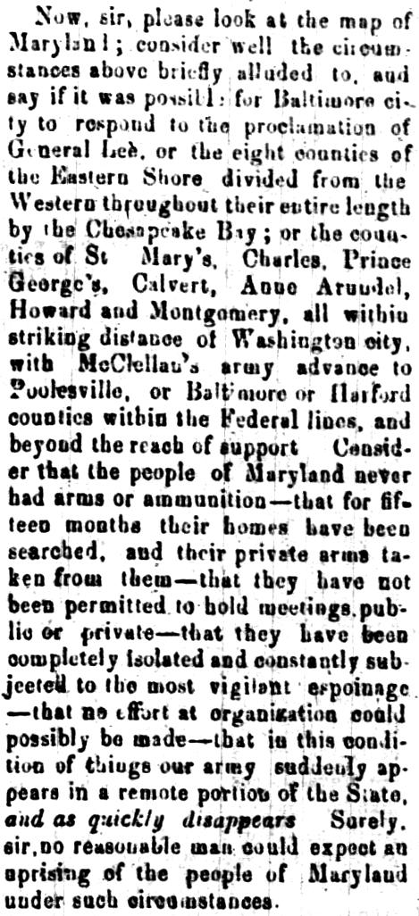 Letter to the Richmond Dispatch from MD ex-Gov. Enoch Louis Lowe defending Marylanders as being secessionists at heart, despite the poor reception of the invading Rebel army. Other articles in image: Poem "Little Minnie's Wish" from New Orleans Delta. "The Way of the Transgressor is Hard", recounting Wilkes-Barre southern sympathizer ridden on rail to his mother's house, where she said he was a traitor and take him south to Jeff Davis; she had two other sons in Union service and regards him as a disgrace to family.