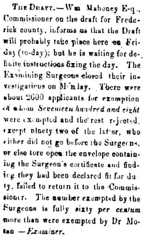 William Mahoney, commissioner on the draft for Frederick County believes draft will take place today, but is awaiting instructions. Surgeons investigation of about 2600 applicants for exemption resulted in 1708 being exempted, 892 rejected. Of the applicants rejected, 92 did not return the finding certificate of fitness for duty. the number exempted by the surgeons is 60 per cent more than the number exempted by Dr. Moran. [Examiner]