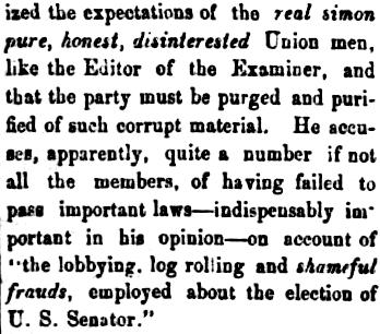 Editorial: State legislature did not elect Henry W. Davis, a radical Republican, to the U.S. Senate, which angered the editor of the rival Examiner newspaper. The Citizen editorial reviles the Examiner editor, asking who in the legislature should be removed to "purify" the Union Party.