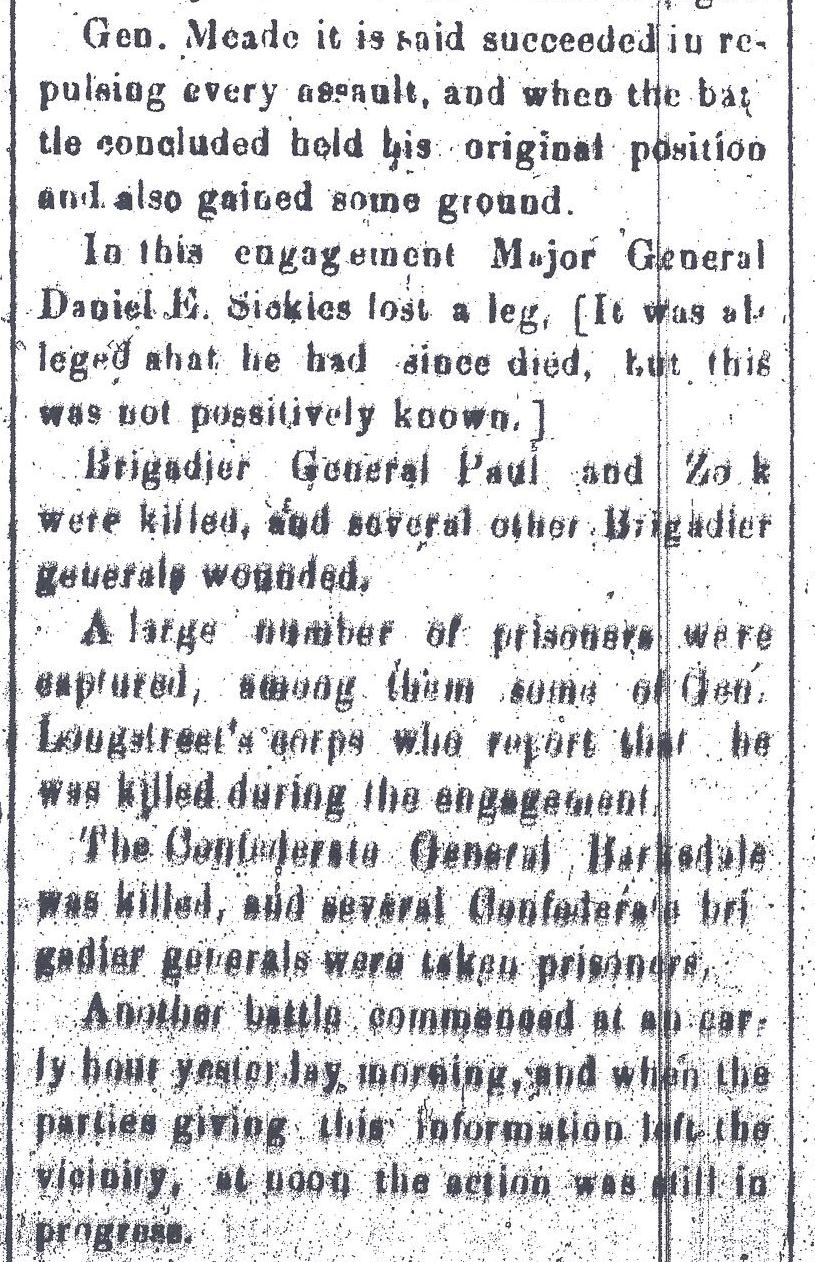 First news and details of a severe battle near Gettysburg, which began Wednesday and continued to Thursday. Lee has engaged Meade’s right flank until 10 o’clock at night, but Meade successfully repelled him. In the battle, Maj. General Sickles lost a leg and Brig. Generals Paul and Zonk were killed, along with a few Confederate officers.