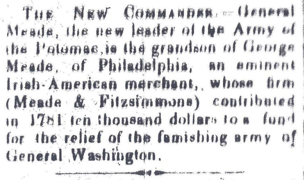 The new commander of the Army of the Potomac, General Meade, is the grandson of a prominent Irish-American merchant.